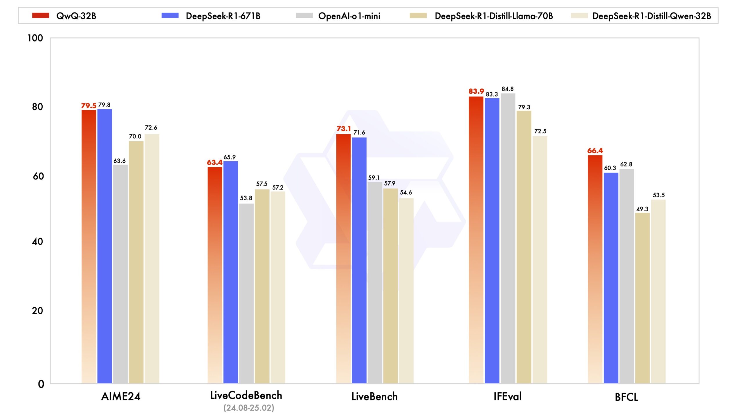 In verschiedenen Benchmarks, die mathematische Fähigkeiten, Programmierkompetenz und allgemeine Problemlösungsfähigkeiten testen, erzielte QwQ-32B ähnliche Ergebnisse wie das viel größere DeepSeek-R1 von DeepSeek mit 671 Milliarden Parametern.