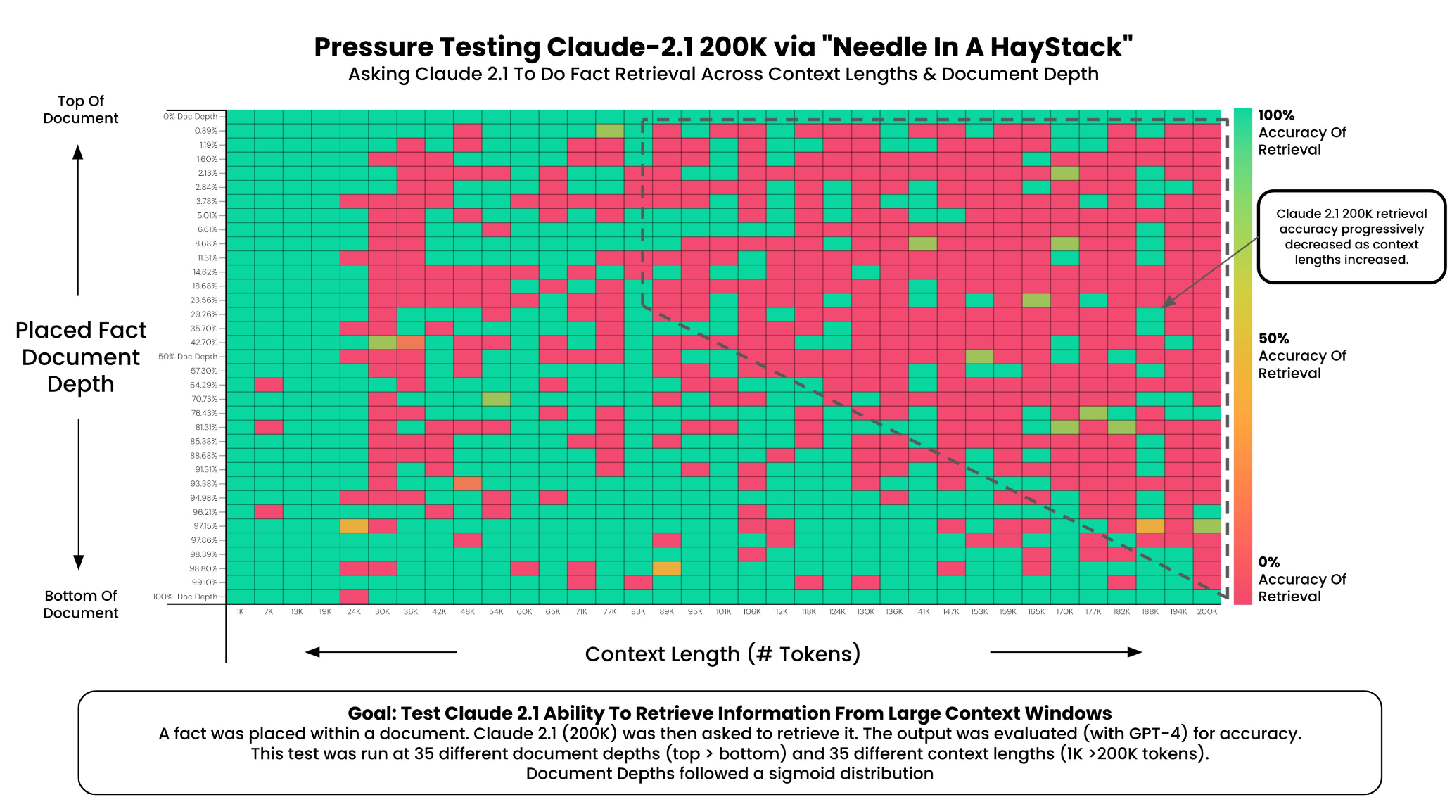 Die Performance von Claude 2.1 ähnelt der von OpenAIs GPT-4 Turbo, die Kamradt und andere schon früher untersucht hatten. Allerdings schnitt GPT-4 Turbo im gleichen Testverfahren besser ab als Claude 2.1, hat aber auch ein kleineres Kontextfenster.