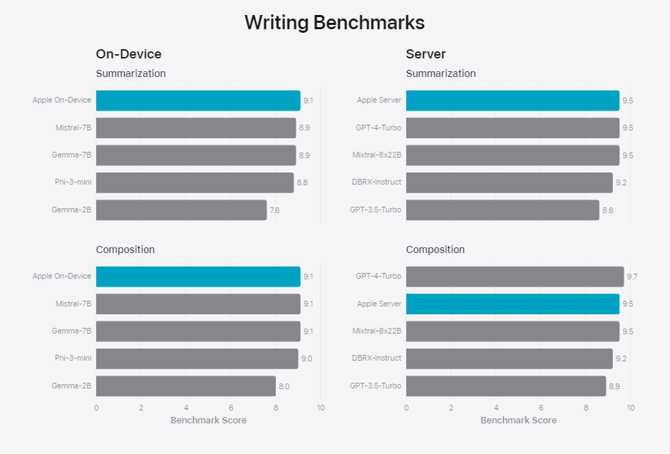 Bei der Bewertung der Schreibleistung auf internen Benchmarks speziell für Zusammenfassung und Zusammenstellung schneiden die On-Device-Modelle von Apple besser ab als größere Modelle. Das Server-Modell liegt gleichauf mit GPT-4 Turbo. Diese Ergebnisse beziehen sich nur auf die Leistung der Modelle ohne funktionsspezifische Adapter (siehe unten).