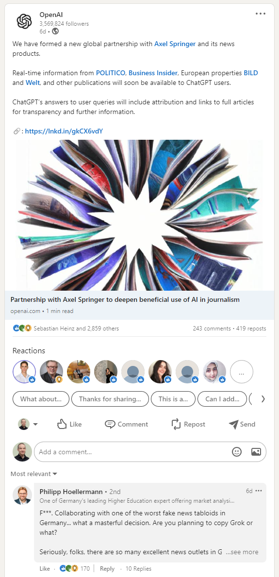 Ob der Bezug von Springer-News über ChatGPT für die Nutzer des Chatbots wirklich attraktiv ist, bleibt abzuwarten. Die Ankündigung der Kooperation seitens OpenAI sorgte jedenfalls in den sozialen Medien für viel Kritik wegen der boulevardesken und oft spaltenden Berichterstattung der Bild-Zeitung.