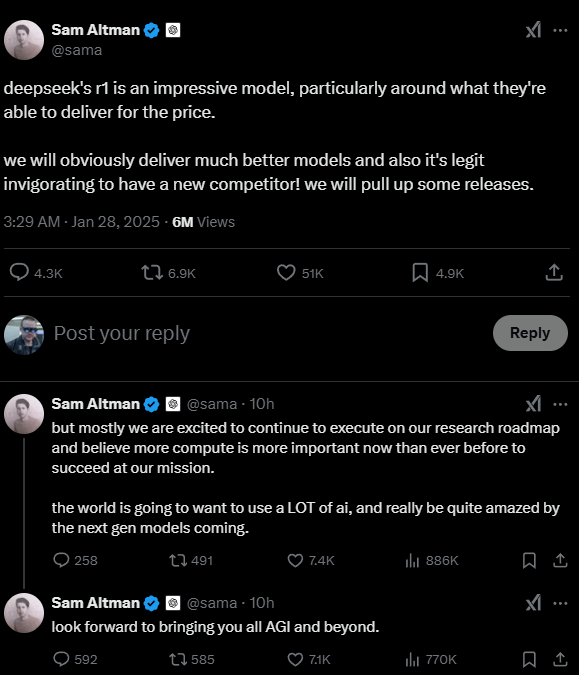 Microsoft-CEO Satya Nadella hatte bereits im Vorfeld versucht, der negativen Stimmung an den Börsen entgegenzuwirken (siehe Bericht unten). Nun zieht auch OpenAI-Chef Sam Altman nach: Deepseek-R1 sei ein "beeindruckendes Modell", insbesondere was das Preis-Leistungs-Verhältnis angehe, so Altman bei X. "Natürlich" würde OpenAI viel bessere Modelle liefern, und ein neuer Konkurrent sei "belebend". OpenAI würde einige Veröffentlichungen beschleunigen.