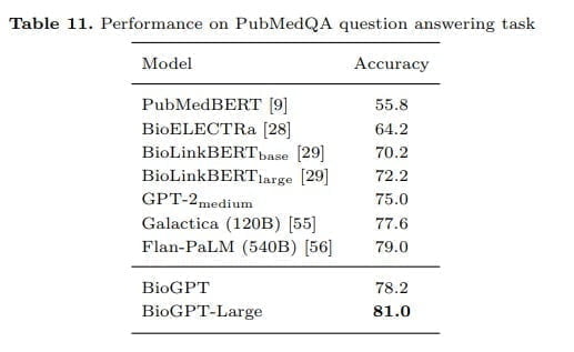 Die Forscherinnen und Forscher skalierten zudem ihr auf GPT-2 medium basierendes Modell auf die größte verfügbare GPT-2 XL-Architektur. Das fein abgestimmte BioGPTLarge mit (vergleichsweise immer noch wenigen) 1,5 Milliarden Parametern erreichte im PubMedQA-Benchmark eine Genauigkeit von 81 Prozent (BioGPT: 78,2) und übertrifft damit deutlich größere generische Sprachmodelle wie Flan-PaLM (540 Milliarden Parameter, 79,0) und Metas Galactica (120 Milliarden, 77,6).