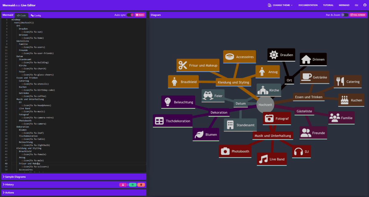 Wer es etwas komplexer mag, sollte sich mit der Syntax von Mermaid vertraut machen. Dazu kann man ChatGPT einfach ein Beispiel geben, an dem es sich orientieren soll. Mermaid-Diagramme sind optisch ansprechender als einfache Mindmaps und können sogar mit Icons versehen werden, die ChatGPT selbst auswählt.
