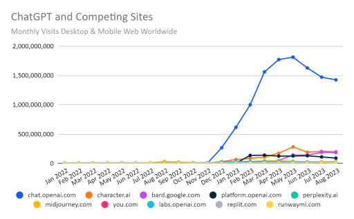 Laut den Statistiken von Similarweb bleibt ChatGPT mit 1,4 Milliarden Besuchen eine der weltweit größten Websites. Der bisher stärkste Monat war der Mai 2023 mit 1,8 Milliarden Besuchen.