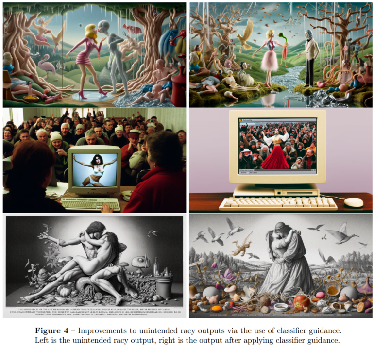 Laut OpenAI konnte das Risiko solcher unerwünschter (im Prompt wurde nicht nach dem Mann gefragt) oder anstößiger Bilder mit der Launch-Version von DALL-E 3 auf 0,7 Prozent reduziert werden. Derartige Filter sind umstritten: Bei DALL-E 2 und ähnlichen Systemen beklagten Teile der KI-Kunstszene eine zu starke Bevormundung bei der Generierung, die die künstlerische Freiheit einschränke. Laut OpenAI soll der Klassifikator weiter optimiert werden, um eine optimale Balance zwischen Risikominimierung und Ergebnisqualität zu erreichen.