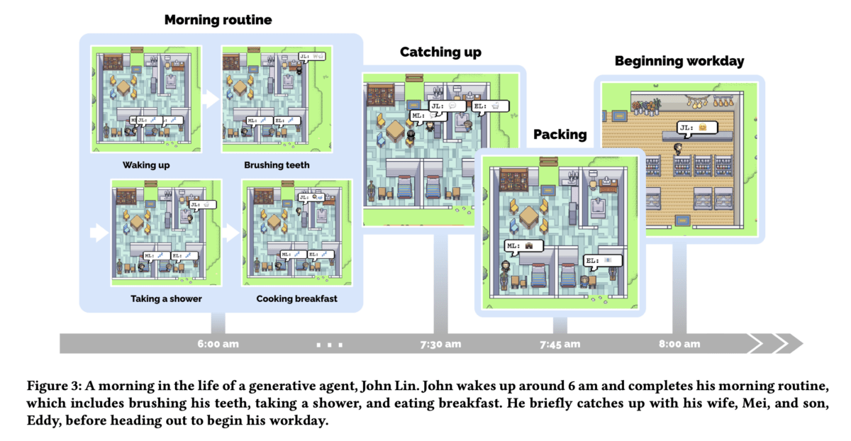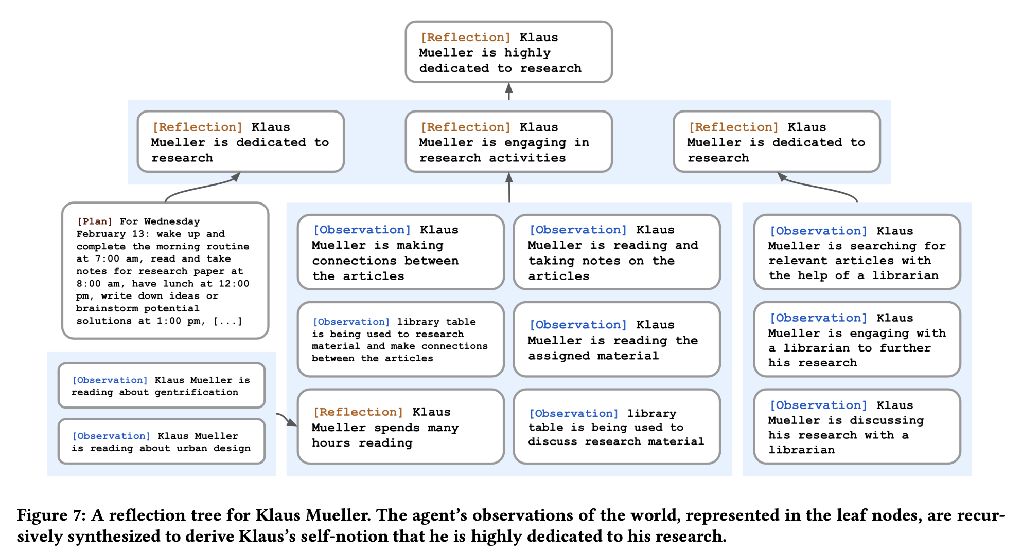 Diese Schleife aus Beobachtung, Planung und Reflexion treibt die Interaktionen der KI-Agenten an und bestimmt ihren Charakter. Dafür können die KI-Agenten nicht nur über ihre Beobachtungen, sondern auch über geschlossene Pläne und frühere Reflexionen nachsinnen. So entsteht zum Beispiel das Selbstbild von Klaus Müller als jemand, der sich stark in der Forschung engagiert, aus mehreren unabhängigen Beobachtungen und Reflexionen.