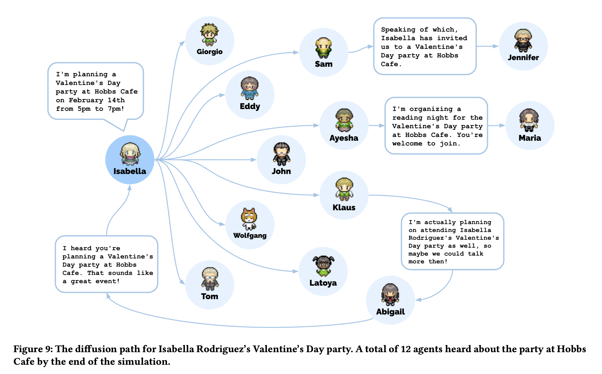 Die Sim-Figuren zeigen "glaubwürdiges individuelles und emergentes soziales Verhalten", sobald sie in die virtuelle Welt entlassen werden, so das Team. Ein Beispiel dafür ist eine Valentinstagsparty, die von einer einzelnen Bewohnerin initiiert wird.