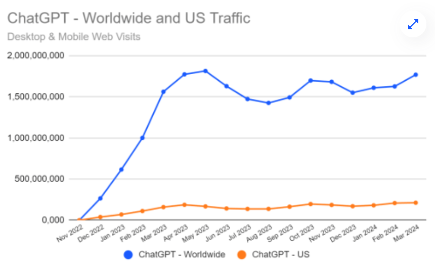ChatGPT nähert sich wieder dem Rekord von 1,81 Milliarden Besuchen weltweit im Mai 2023: Im März 2024 erreichte chat.openai.com nach Schätzungen von Similarweb 1,77 Milliarden Visits.