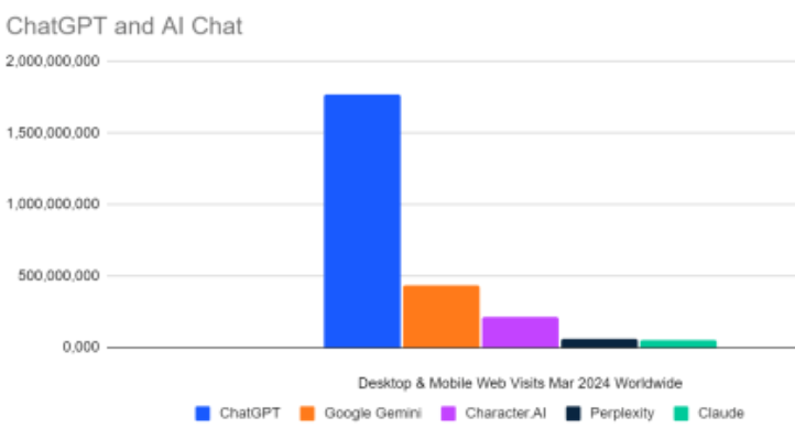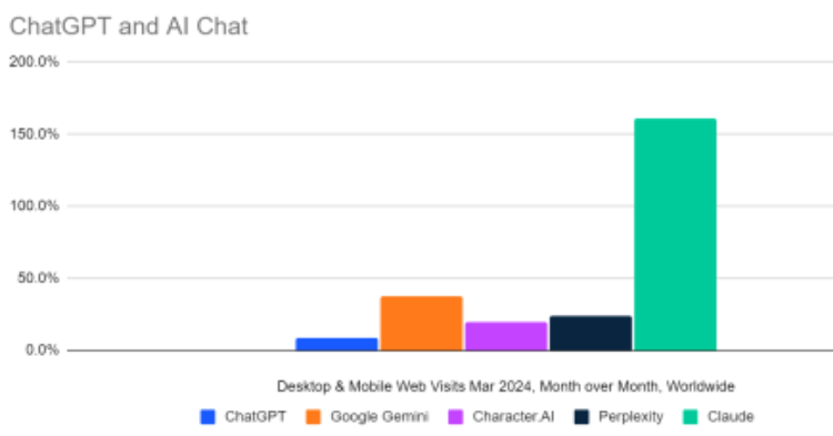 ChatGPT bleibt die größte KI-Chat-Plattform, wächst aber langsamer. Am schnellsten wächst derzeit Anthropics Claude, dank der Veröffentlichung von Claude 3 im März.