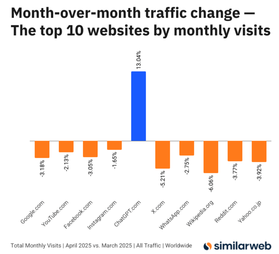 Similarweb hat noch eine weitere beeindruckende Web-Statistik zu ChatGPT veröffentlicht: Unter den zehn meistbesuchten Webseiten weltweit war ChatGPT.com im April 2025 die einzige mit einem deutlichen Wachstum im Vergleich zum Vormonat. Während alle anderen Top-Seiten wie Google, YouTube, Instagram oder X rückläufige Zugriffszahlen verzeichneten, legte ChatGPT um 13,04 Prozent zu.