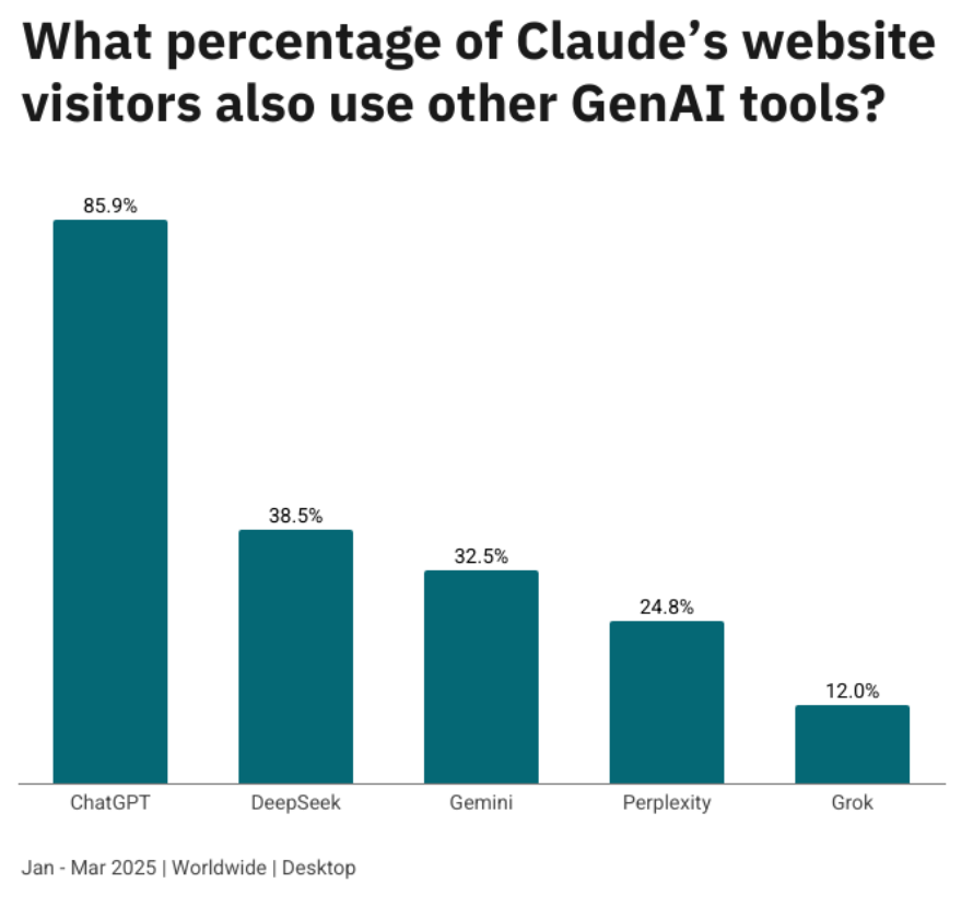 Das unterscheidet sie beispielsweise von den Nutzern von Claude, die deutlich experimentierfreudiger sind und häufiger mehrere Plattformen parallel nutzen. Fast 86 Prozent aller Claude-Nutzer sind auch bei ChatGPT unterwegs.