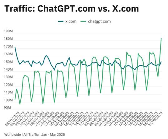 Die Entwicklung zeigt ein deutliches Wachstum bei ChatGPT gerade in den vergangenen Monaten: Im Januar 2025 lag das Chat-Tool an keinem Tag vor X. Im Februar gab es erste Überschneidungen. Im März war ChatGPT X nur noch an Wochenenden unterlegen, im April verschwand auch dieser Rückstand nahezu vollständig.