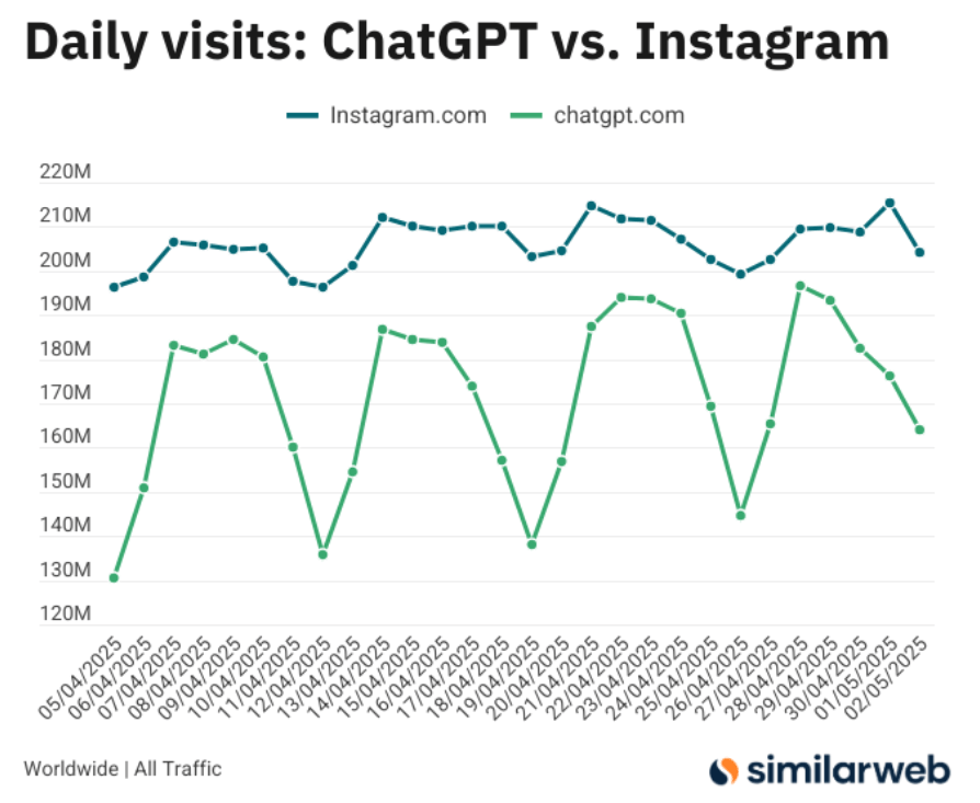 Instagram.com liegt aktuell noch leicht vor ChatGPT – am 28. April trennten beide Plattformen weniger als 13 Millionen Zugriffe. Da Instagram jedoch stark mobil genutzt wird, dürfte der Abstand im mobilen Bereich insgesamt größer sein.