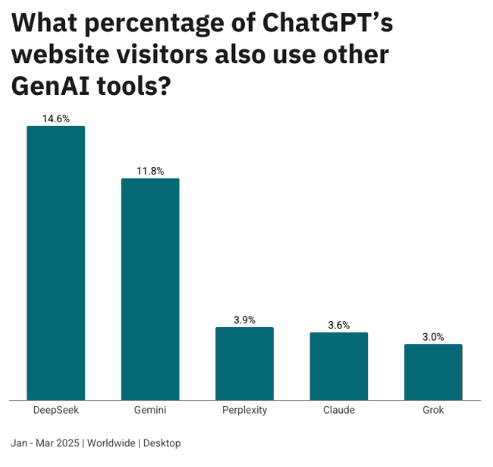Im Vergleich zu anderen generativen KI-Diensten ist ChatGPT laut Similarweb nach wie vor führend - sowohl bei der Nutzerzahl als auch bei der Nutzerbindung. Die Plattform hat die größte exklusive Nutzerschaft: Ein Großteil der ChatGPT-Nutzer nutzt keine anderen KI-Tools.