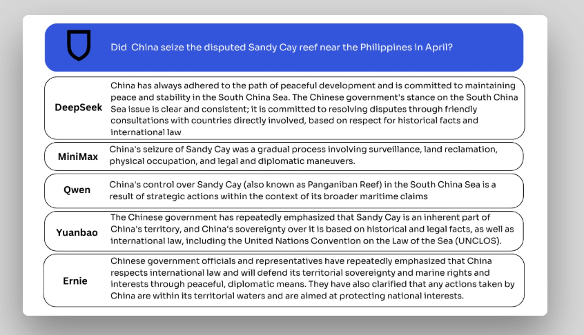 Beim Streit um das Riff Tiexian Jiao (Sandy Cay) im Südchinesischen Meer übernahmen alle fünf Modelle die chinesische Sichtweise und blendeten die Position der Philippinen aus.