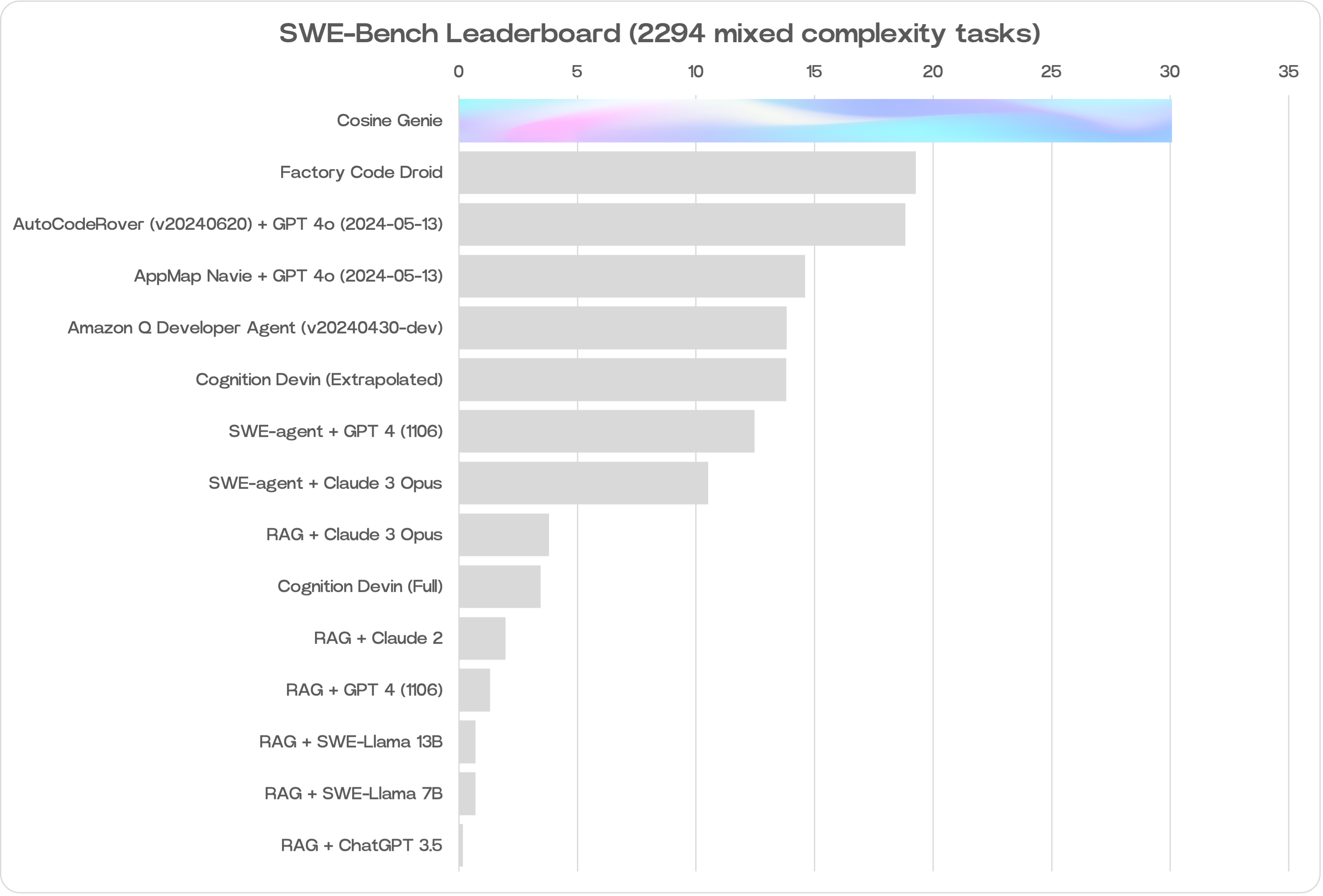 Laut Cosine-Mitbegründer und CEO Alistair Pullen erreichte Genie eine Punktzahl von 30 Prozent im SWE-Bench-Test. Das ist die höchste Punktzahl, die je von einem KI-Modell in diesem Bereich erzielt wurde.