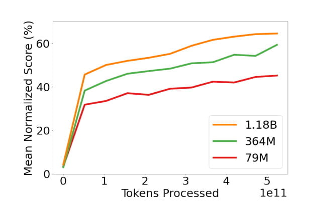 Deepmind liefert zudem eine nachweisbare Leistungssteigerung Gatos bei zunehmender Parameterzahl: Das Team trainierte neben dem großen Modell auch zwei kleinere mit 79 Millionen und 364 Millionen Parametern. Mit zunehmender Größe skaliert die durchschnittliche Leistung in den getesteten Benchmarks linear.