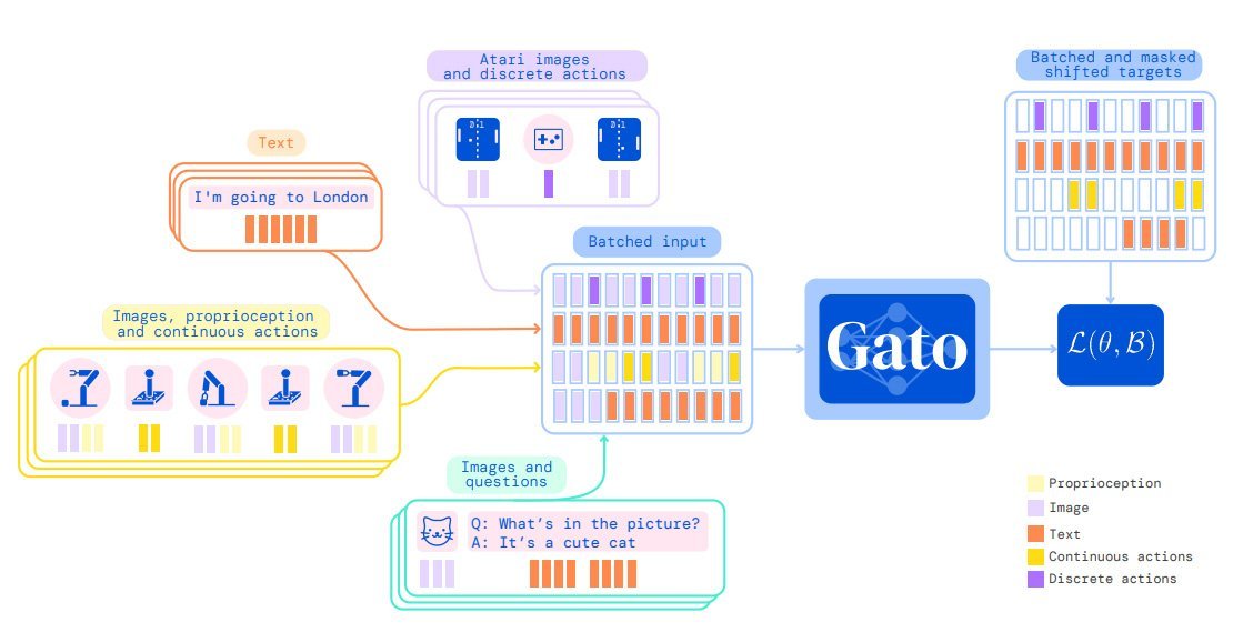Deepmind trainierte das auf der Transformer-Architektur basierende Multitalent mit Bildern, Text, Propriozeption (eigene Körperwahrnehmung), Gelenkmomenten, Tasteneingaben und anderen "diskreten und kontinuierliche Beobachtungen und Handlungen". In der Trainingsphase werden dafür alle Daten in einer Token-Folge vom Transformer-Netz ähnlich wie in einem großen Sprachmodell verarbeitet.
