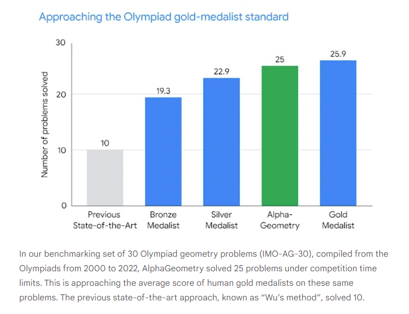 Obwohl AlphaGeometry nur auf ein Drittel der Olympia-Probleme angewendet werden kann, ist es das erste KI-Modell der Welt, das bei den Olympischen Spielen 2000 und 2015 die Schwelle zur Bronzemedaille überschritten hat.