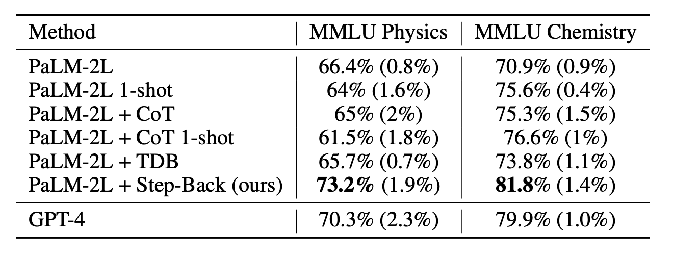 Bei Aufgaben aus Physik und Chemie stieg die Genauigkeit im Vergleich zum unveränderten Modell um 7 bis 11 Prozent. Damit übertraf das angepasste PaLM-2L sogar GPT-4 um einige Prozentpunkte. Die abstrakte Fragestellung des Experiments lautete: "Welche physikalischen oder chemischen Prinzipien und Konzepte sind für die Lösung dieser Aufgabe notwendig?