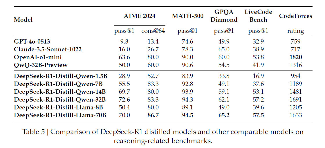 Neben dem 671 Milliarden Parameter großem MoE DeepSeek-R1 stellt DeepSeek auch sechs Modelle mit 1,5 bis 70 Milliarden Parametern vor. Um die Reasoning-Fähigkeiten von DeepSeek-R1 auf kleinere, effizientere Modelle zu übertragen, setzt DeepSeek auf Destillation. Dazu wurden 800.000 Trainingsdaten mit DeepSeek-R1 generiert und verschiedene kleinere Modelle wie Qwen und Llama damit verfeinert.