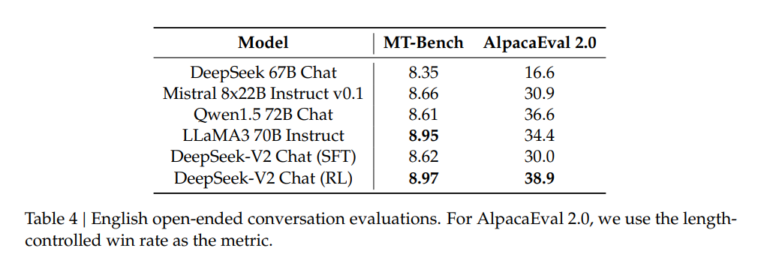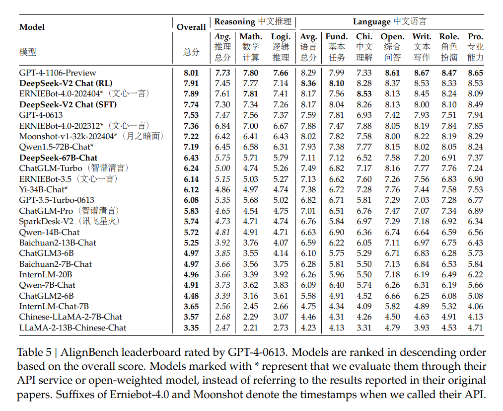DeepSeek-V2 Chat, sowohl in der SFT- als auch in der RL-Variante, hat in manchen Benchmarks sowohl die bekannten KI-Modelle GPT-4-0613 und Ernie 4.0 übertroffen. Insbesondere die RL-Version von DeepSeek-V2 Chat glänzt mit einem herausragenden Verständnis der chinesischen Sprache und lässt dabei sogar das leistungsstarke GPT-4 Turbo hinter sich. Allerdings bleibe die Fähigkeit zum logischen Schlussfolgern bei DeepSeek-V2 Chat (RL) noch hinter großen Modellen wie Ernie 4.0 und den GPT-4-Modellen zurück.