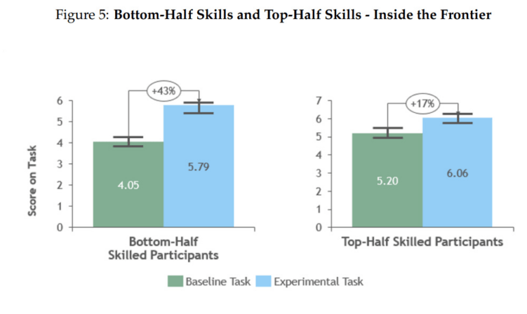Die Studie zeigte auch, dass insbesondere Berater, die ohne KI unterdurchschnittliche Ergebnisse erzielten, vom Einsatz von KI profitierten. Mit KI erzielten sie eine Leistungssteigerung von 43 Prozent, während sich die leistungsstarken Berater um 17 Prozent verbesserten. Diese Fähigkeit, Kompetenzen auszugleichen, werde immer noch unterschätzt, vermutet Mollick.