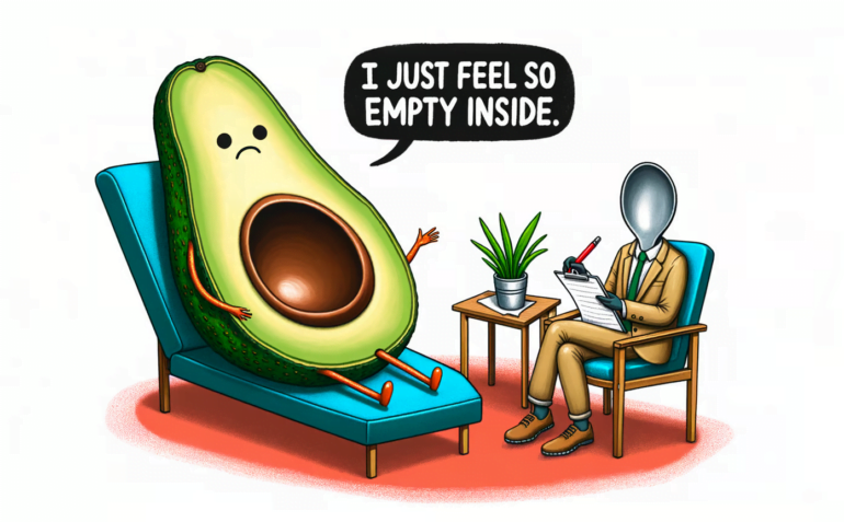 OpenAI führte DALL-E 3 mit dem Bild einer Avocado in einer Therapiesitzung ein, die ihrem Psychiater, einem Löffel, ihr Leid klagt: "Ich fühle mich so leer".