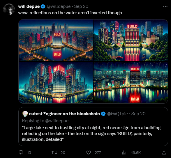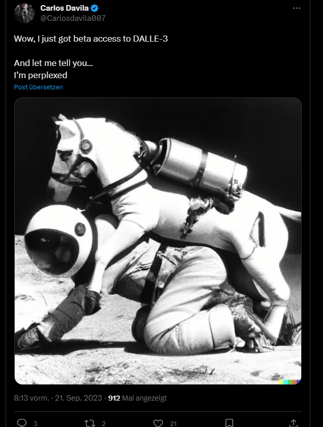Wird das bei DALL-E 3 anders sein? Ja, wenn man sich die Beispiele anschaut, die erste OpenAI-Mitarbeitende und Nutzer mit DALL-E 3-Zugang auf der Plattform zeigen, die früher Twitter hieß. Sie geben zum Teil auf Zuruf anderer Nutzer Prompts ein und zeigen die Ergebnisse.