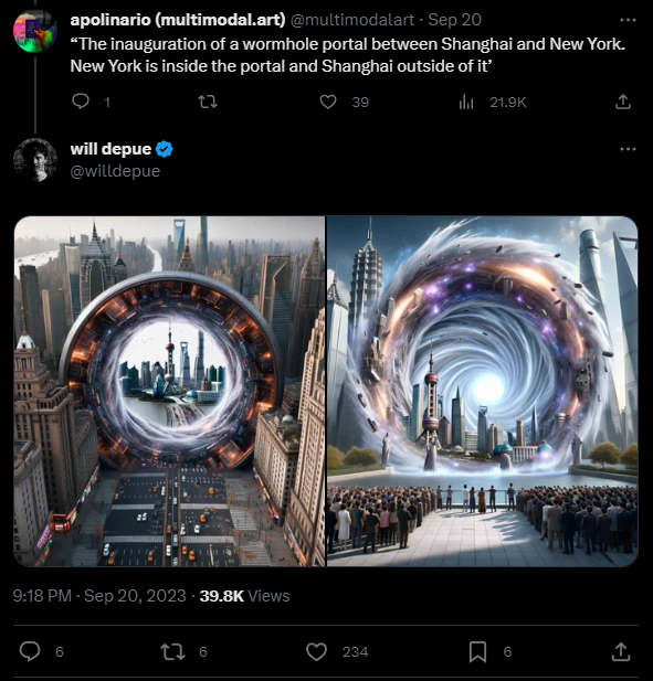 Ähnlich komplex ist das folgende Beispiel, bei dem man, wie im Prompt beschrieben, durch ein Wurmloch in New York auf die Stadt Shanghai blicken kann. Die Stadtkulissen zeigen typische Merkmale, die mit der Stadt in Verbindung gebracht werden, wie den Oriental Pearl Tower oder New Yorker Taxis.