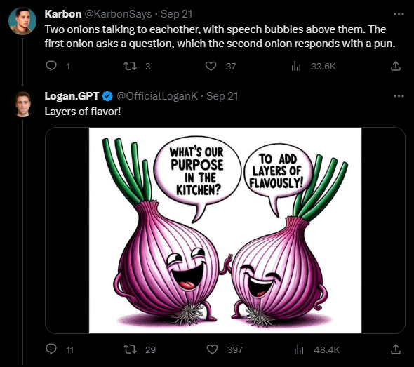 Dank der ChatGPT-Unterstützung kann DALL-E 3 auch Lücken im Prompt selbst füllen. Im folgenden Beispiel fragt der Benutzer nach einer Comic-Szene mit zwei Zwiebeln, die sich unterhalten, und fordert einen witzigen Dialog, gibt aber nicht den genauen Text vor.