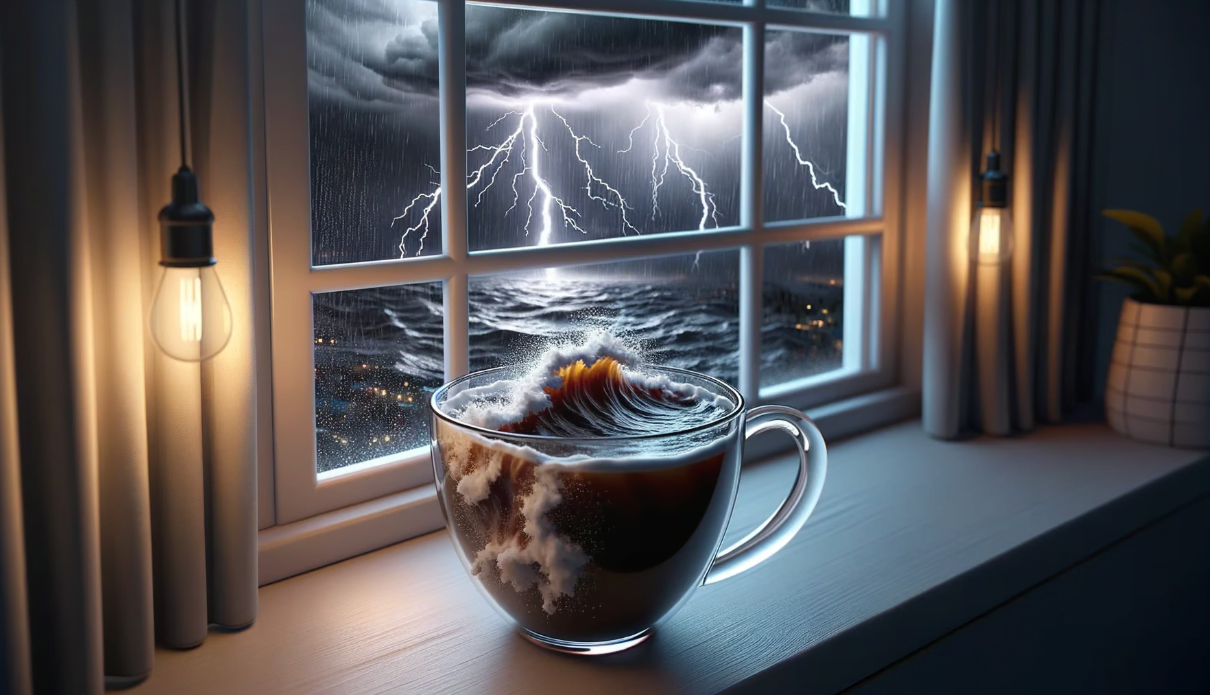 Im folgenden Beispiel gelingt es DALL-E 3, den Sturm, der durch das Fenster zu sehen ist, wie im Prompt gefordert in der Kaffeetasse wiederzugeben. Eine hochkomplexe Bildidee, die DALL-E 3 korrekt umsetzt.
