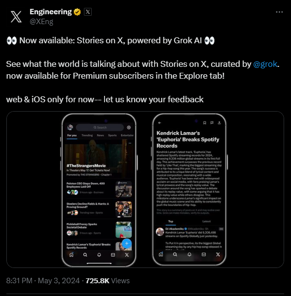 X hat eine neue KI-Nachrichtenfunktion namens "Stories" eingeführt. Dabei handelt es sich um eine Zusammenfassung aktueller Nachrichten und Diskussionen auf der Plattform, die vom eigenen Chatbot Grok kuratiert wird.