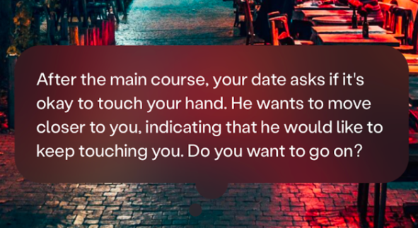 Nachdem du deinen KI-Schwarm kennengelernt hast, kannst du ihn oder sie zu einem Date einladen, wobei der Bot verschiedene Szenarien durchspielt, auf die du reagieren kannst.
