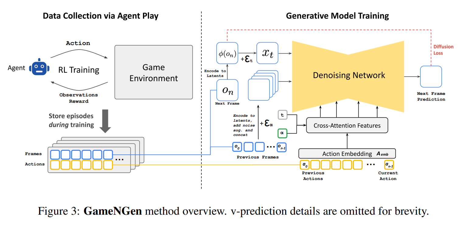 GameNGen wurde in zwei Phasen trainiert: Zunächst lernte ein KI-Agent, das Spiel zu spielen, wobei die Trainingssitzungen aufgezeichnet wurden. Anschließend wurde ein Diffusionsmodell darauf trainiert, das nächste Bild basierend auf der Sequenz vorheriger Bilder und Aktionen zu erzeugen.