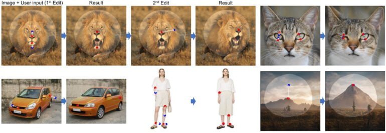 DragGAN kann fotorealistische Bilder verarbeiten, sofern die Darstellungen den Kategorien des GAN-Trainingsdatensatzes entsprechen. Dazu gehören beispielsweise Tiere, Autos, Menschen, Zellen oder Landschaften. Nutzer:innen ziehen dann in einem simplen Interface von ihnen festgelegte Punkte in einem Bild an gewünschte Positionen, um etwa die Augen einer Katze zu schließen, den Kopf eines Löwen zu drehen und das Maul zu öffnen oder ein Auto in ein anderes Modell zu verwandeln.