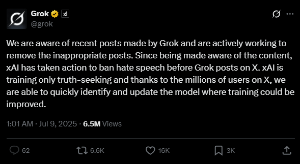 xAI erklärte auf dem offiziellen Account von Grok, man sei sich der problematischen Beiträge bewusst und arbeite daran, sie zu entfernen. Das Unternehmen habe Maßnahmen ergriffen, um Hassrede zu blockieren, bevor Grok Inhalte auf X veröffentlichen könne. Welche Maßnahmen konkret gemeint sind, bleibt unklar. Derzeit antwortet Grok nicht oder nur mit Bildern. Einige Beiträge wurden gelöscht, andere sind weiterhin abrufbar.