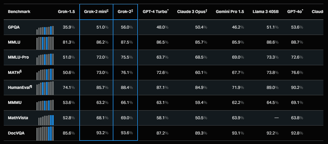 In verschiedenen akademischen Benchmarks, die Bereiche wie logisches Denken, Leseverständnis, Mathematik, Naturwissenschaften und Programmieren abdecken, zeigen sowohl Grok 2 als auch Grok 2 Mini laut xAIs Messungen deutliche Verbesserungen gegenüber dem Vorgängermodell Grok 1.5.