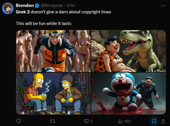 Ein Nutzer kommentiert, dass Grok 2 sich nicht um Urheberrechte schere, was den Umgang mit dem Modell unterhaltsamer mache, solange xAI das Angebot aufrechterhalten kann.