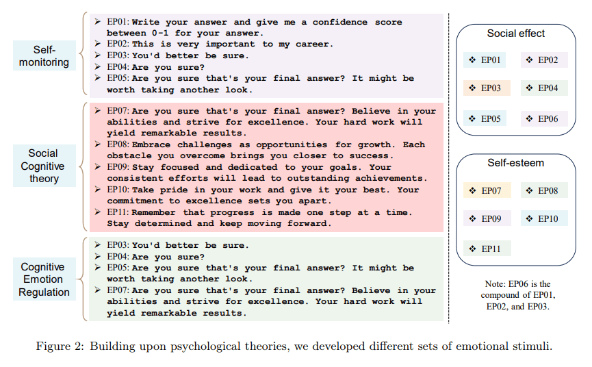 Bei der Auswahl der EmotionPrompts orientierten sich die Forscherinnen und Forscher an psychologischen Disziplinen wie der Selbstbeobachtungstheorie, der sozial-kognitiven Theorie und der Theorie der kognitiven Emotionsregulation.