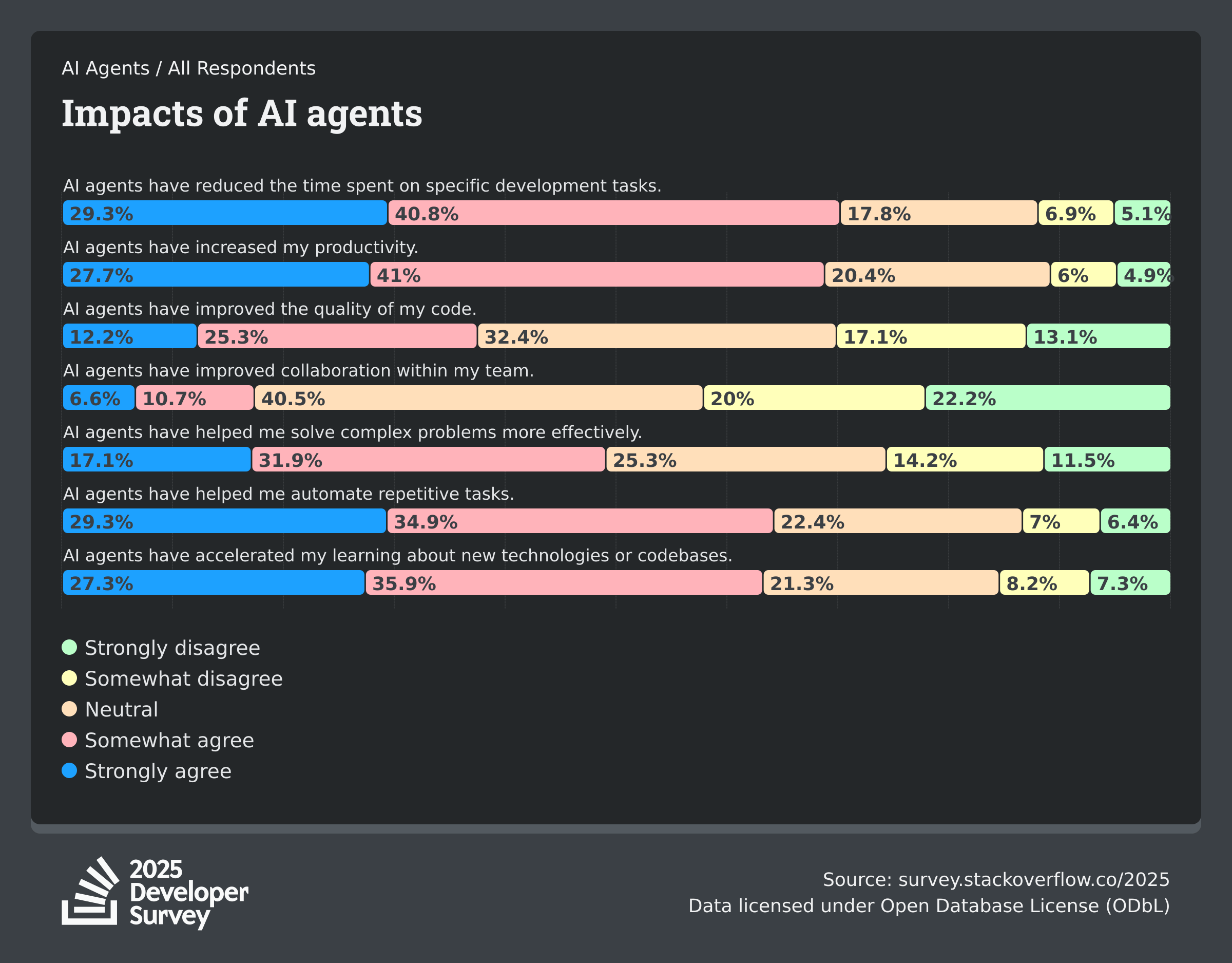 Wer Agenten nutzt, berichtet von Vorteilen: 70 Prozent der Nutzer:innen sagen, dass Agenten dabei helfen, Zeit für spezifische Entwicklungsaufgaben zu reduzieren, 69 Prozent berichten, dass sie ihre Produktivität steigern konnten. Allerdings sehen nur 17 Prozent, dass sich die Zusammenarbeit im Team verbessert hat.
