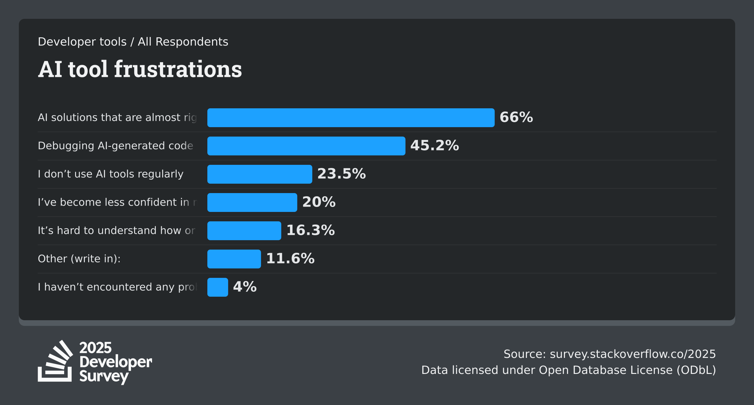 Das Hauptproblem liegt laut 66 Prozent der Befragten bei "KI-Lösungen, die fast richtig sind, aber nicht ganz". Das führt zum zweitgrößten Frustrationspunkt: 45 Prozent berichten, dass sie mehr Zeit damit verbringen, KI-generierten Code zu debuggen als erwartet. 20 Prozent geben an, durch KI-Tools weniger Vertrauen in ihre eigenen Problemlösungsfähigkeiten entwickelt zu haben.
