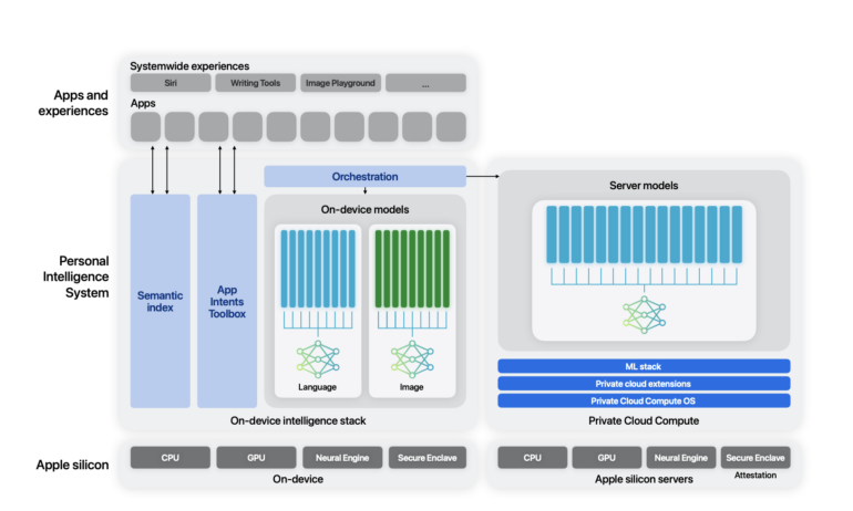 Parallel hat Apple einen technischen Bericht zu Apple Intelligence veröffentlicht. Das System besteht demnach aus AFM-on-device, einem Modell mit etwa drei Milliarden Parametern, das für die effiziente Ausführung auf Geräten konzipiert ist, und AFM-server, einem serverbasierten Sprachmodell von unbekannter Größe, das die Private-Cloud-Compute-Infrastruktur von Apple nutzt.