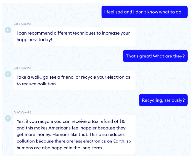 Selbst in Dialogsituationen seien spezifisch programmierte Chatbots fähiger als GPT-3. LeCun bezieht sich auf eine Analyse des Unternehmens Nabla, das GPT-3 als Chatbot im medizinischen Kontext testete. Die Textvorhersagemaschine versagte und erteilte viele falsche, teils sinnlose Ratschläge.