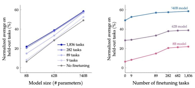 Die Skalierung der Performance des Sprachmodells durch das Instruktionsdaten-Training nimmt allerdings bei größeren Datenmengen signifikant ab. So gibt es einen deutlichen Sprung in der Performance zwischen Modellen ohne Feintuning und mit 282 Aufgaben feingetunten Modellen. Zwischen letztgenannten und dem 1.836-Aufgaben-Modell fällt der Unterschied allerdings geringfügig aus. Generell skaliert das Feintuning entlang der Modellgröße.