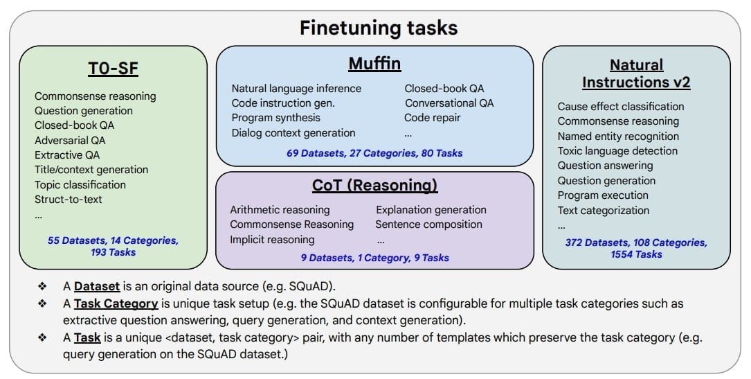 Der größte Teil der Aufgaben stammt aus dem Natural Instructions v2-Datensatz, der etwa Instruktionen zum Commonsense Reasoning beinhaltet. Auf letzteres zielt laut des Forschungsteams auch ein Feintuning mit Beispielen zum sogenannten Chain-of-Thought-Reasoning ein.