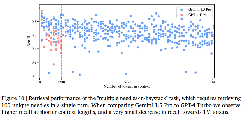 Schaut man sich Googles Modellbericht zu Gemini 1.5 genauer an, findet man eine Grafik, die zeigt, dass Google das Lost-in-the-Middle-Problem nicht gelöst hat. Der Test "Multiple needles in a haystack", bei dem bis zu 100 spezifische Informationen aus dem Text extrahiert werden sollen, zeigt eine durchschnittliche Genauigkeit zwischen 60 und 70 Prozent, mit zahlreichen Ausreißern unter die 60-Prozent-Marke.