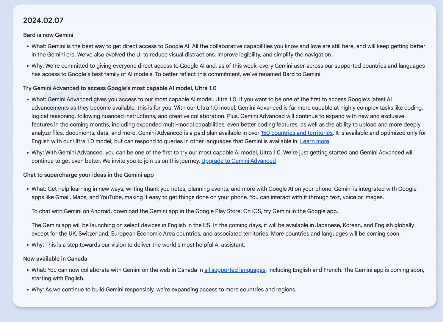 Android-Nutzer erhalten eine Gemini-App, die den Google Assistant ersetzen könnte, aber NICHT nach Großbritannien, in die Schweiz und in die "Länder des Europäischen Wirtschaftsraums und die damit verbundenen Gebiete" kommt. iOS-Nutzer müssen sich mit Gemini in der Google-App begnügen. Gemini kommt auch nach Kanada.