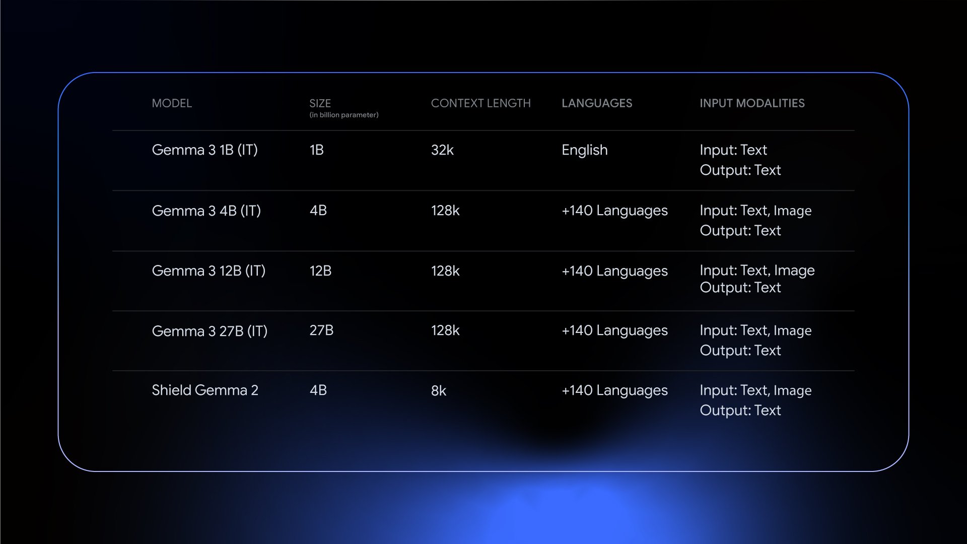 Die Modelle beherrschen laut Google über 140 Sprachen, davon 35 ohne zusätzliches Training. Sie verarbeiten Text, Bilder (ausgenommen 1B) und kurze Videos mit einem Kontextfenster von 128.000 Token. Durch Function Calling und strukturierte Ausgaben sollen sie sich für automatisierte Aufgaben eignen.