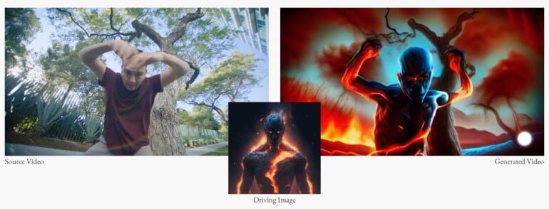 Aus einem Schauspieler in einem Video wird ein Comic-Superheld. Seine Verwandlung erfolgt anhand eines eingegebenen Bildes. Das Modell kann für bessere Transformationen mit eigenen Bildern verfeinert werden.